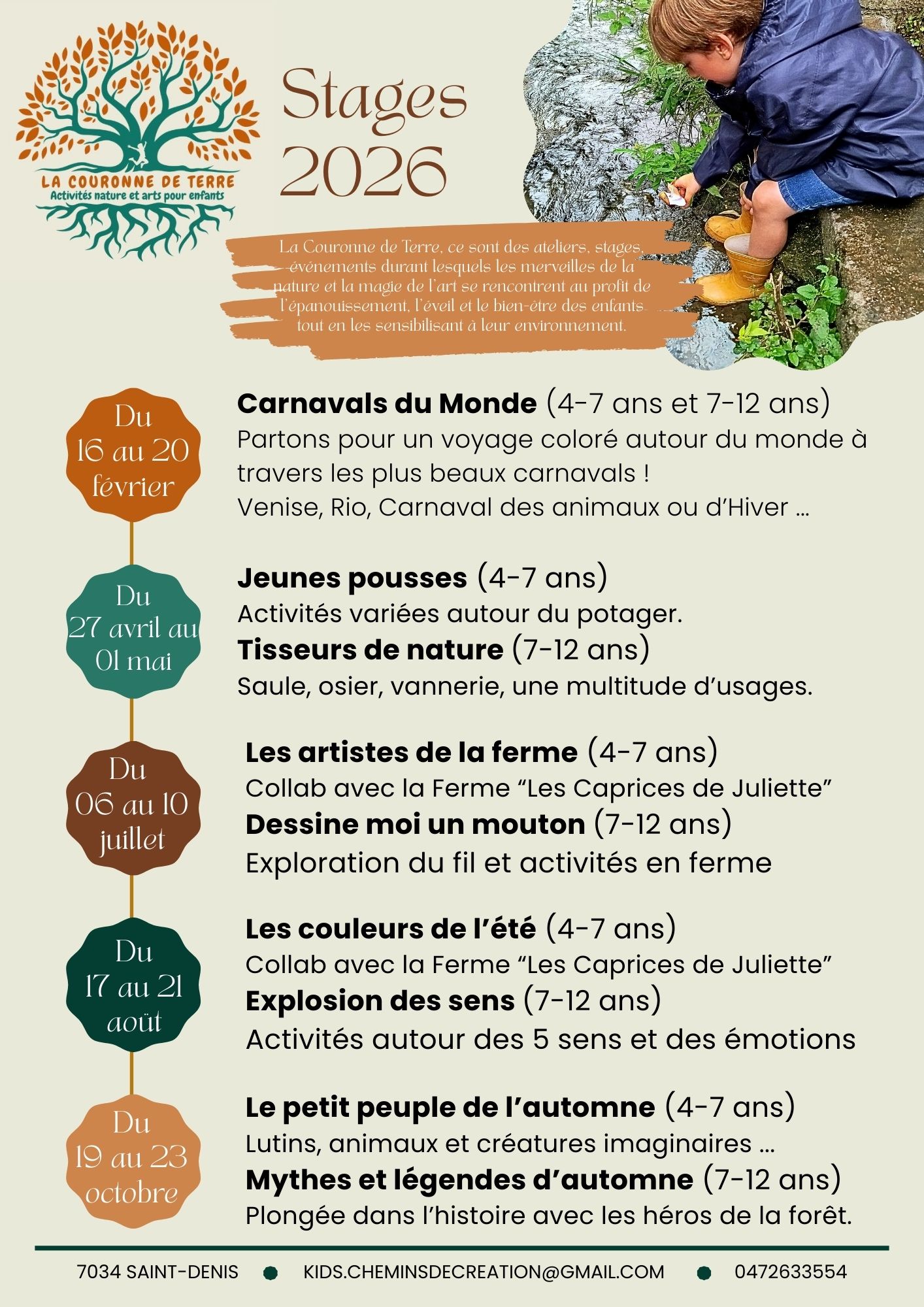 La Couronne de Terre, ce sont des ateliers, stages, évènements durant lesquels les merveilles de la nature et la magie de l’art se rencontrent au profit de l’épanouissement, l’éveil et le bien-être des enfants tous en les sensibilisant à leur environnement.
